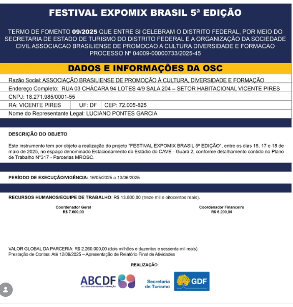 Realizar a 5ª edição do Festival Expomix Brasil, um evento de turismo de eventos e turismo cultural, com o propósito de promover o Destino Brasília como palco de grandes eventos, destacando a Região Administrativa do Guará como espaço estratégico para o desenvolvimento do turismo na capital federal. |